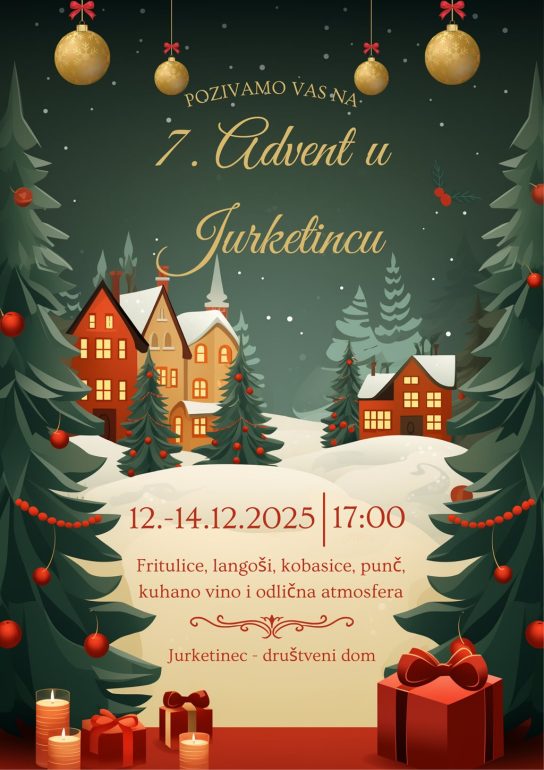 Advent u Jurketincu održat će se na parkingu ispred Društvenog doma u Jurketincu, a počinje u petak 12. prosinca u 17 sati, te završava u nedjelju 14. prosinca. Riječ je o tradicionalnom projektu Udruge žena Jurketinec čije članice kroz tri dana posjetiteljima i svojim sumještanima nude niz zanimljivih sadržaja i