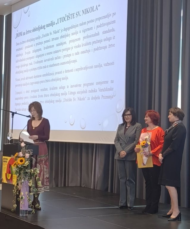Priznanje za zapažene uspjehe u radu, zalaganje za opće dobro i solidarnost u zajednici dodijeljeno je i Domu za žrtve obiteljskog nasilja „Utočište Sveti Nikola“ Varaždin, a u ime ustanove nagradu je preuzela ravnateljica Irena Mađarić.
