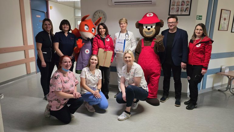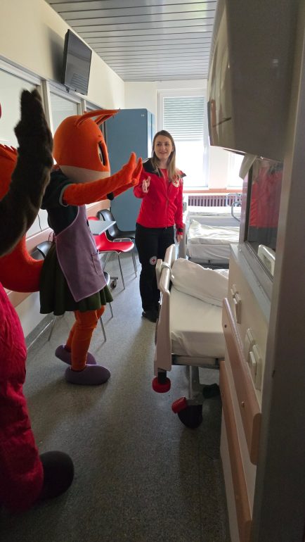 Uz ravnateljicu Sandru Mintas, djelatnice Helenu i Elu te volonterke Janu i Luciu, u posjet su stigle i maskote Mede Jurice i Vjeverice Mire. Svojim su dolaskom i vedrinom razveselile najmlađe pacijente. Tijekom druženja Odjelom su se širili osmijesi, a upravo su dječja radost i toplina susreta najveća vrijednost ovakvih aktivnosti.