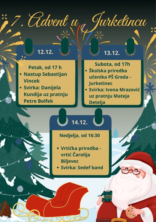 Kao i prijašnjih godina, u Jurketinec stiže Djed Božićnjak koji za najmlađe posjetitelje donosi slatke paketiće, a tu su i nastupi mladih iz Jurketinca i njihovih prijatelja – Danijele Kundija i Petre Bolfek, Sebastijan Vincek, Ivona Mrazović i Matej detelj te Sedef band, a u subotu i nedjelju svoje božićne priredbe održat će učenici područne škole Greda – Jurketinec i mališani iz vrtića Čarolija iz Biljevca.