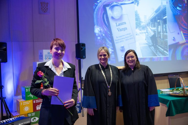 Dekanica fakulteta, izv. prof. dr. sc. Ivana Grčić u vedrom raspoloženju i na sebi kreativno svojstven način iznijela je izvješće ostvarenja i postignutih ciljeva u protekloj godini. Uz skladu s tim, dodijeljene su nagrade i priznanja djelatnicima i studentima s obzirom na postignuti uspjeh, izvrsnost u radu, zalaganje te doprinos povećanju ugleda fakulteta. Najprofesora, najasistenta i najistaknutijeg pojedinca nenastavnog osoblja nagradio je svojim priznanjem i Studentski zbor. Zahvalnice su udijeljene Službi održavanja fakulteta kao i pojedincu na prijedlog kluba ostalih zaposlenika. Nisu zaboravljene ni suradne tvrtke i institucije koje su primile zahvalnice za uspješnu i višegodišnju suradnju.