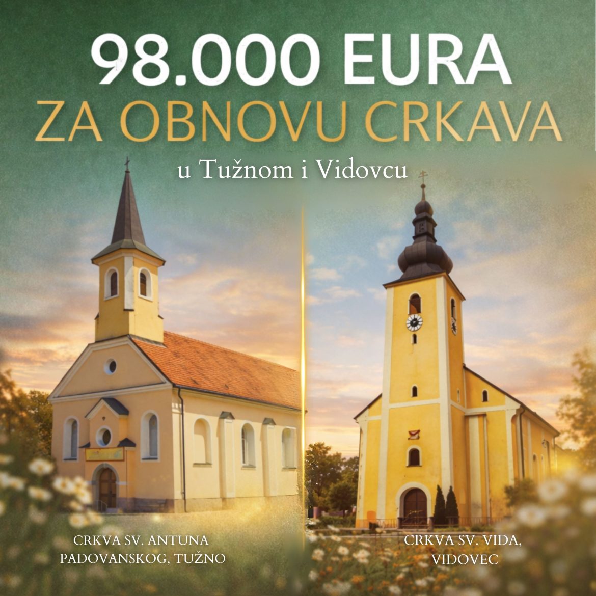 Općina Vidovec i u 2026. godini nastavlja snažno ulagati u očuvanje svoje vrijedne sakralne i kulturne baštine. Od Ministarstva kulture i medija Republike Hrvatske odobreno je ukupno 98.000,00 eura za nastavak konstruktivne sanacije dvaju važnih sakralnih objekata na području općine. Za Crkvu sv. Antuna Padovanskog u Tužnom osigurano je 48.000,00 eura, dok je za Crkvu sv. Vida u Vidovcu i kuriju župnog dvora odobreno 50.000,00 eura. Riječ je o nastavku […]