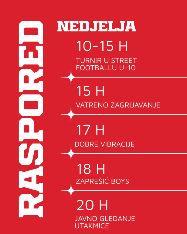 Nedjelja donosi kulminaciju. Od 9 do 10 sati otvorene su prijave za street football turnir za djecu do 10 godina, koji će trajati od 10 do 15 sati. U 15 sati kreće veliko Vatreno zagrijavanje, uvod u najveseliji dio vikenda. U 17 sati na pozornicu stiže bend Dobre vibracije, a sat kasnije i navijački miljenici Zaprešić Boysi, čije će pjesme podići atmosferu do samog vrhunca.